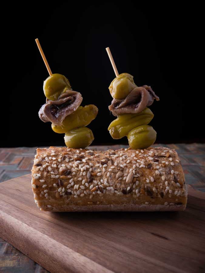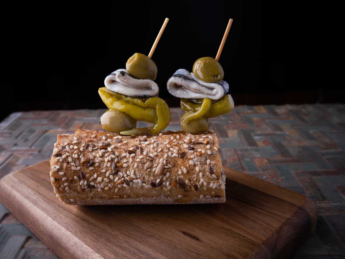 Un clásico pincho con anchoa, aceituna y guindilla, en formato práctico.